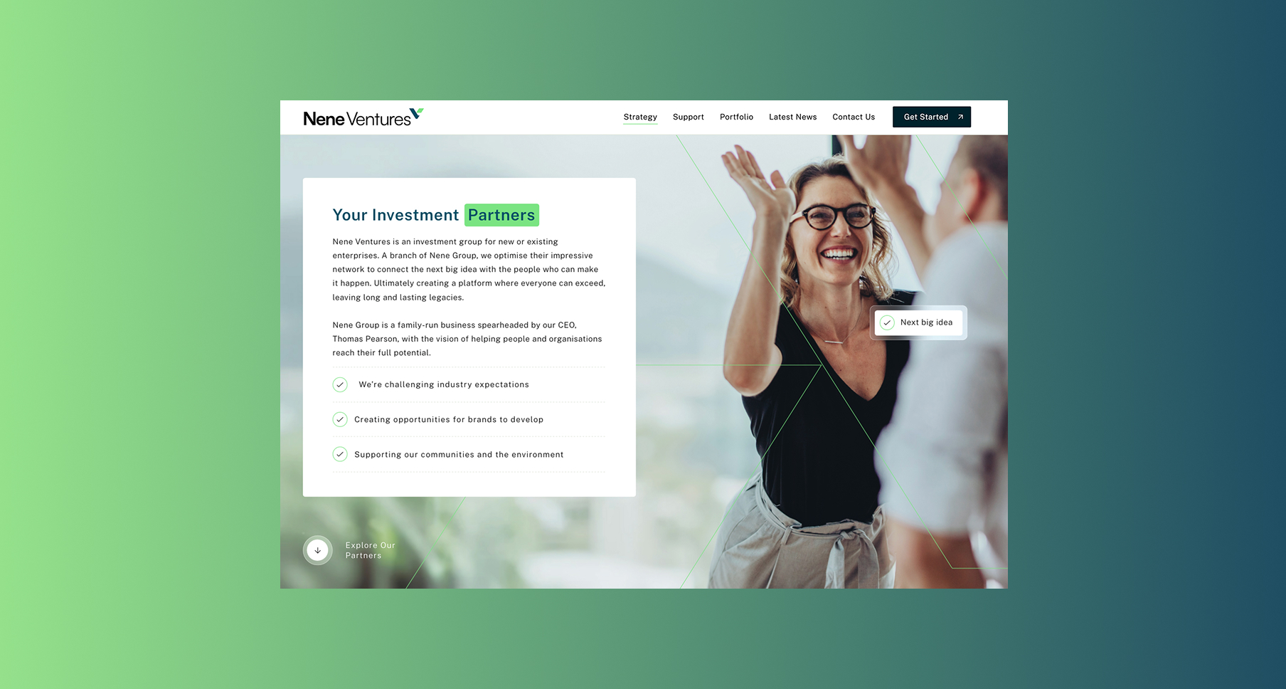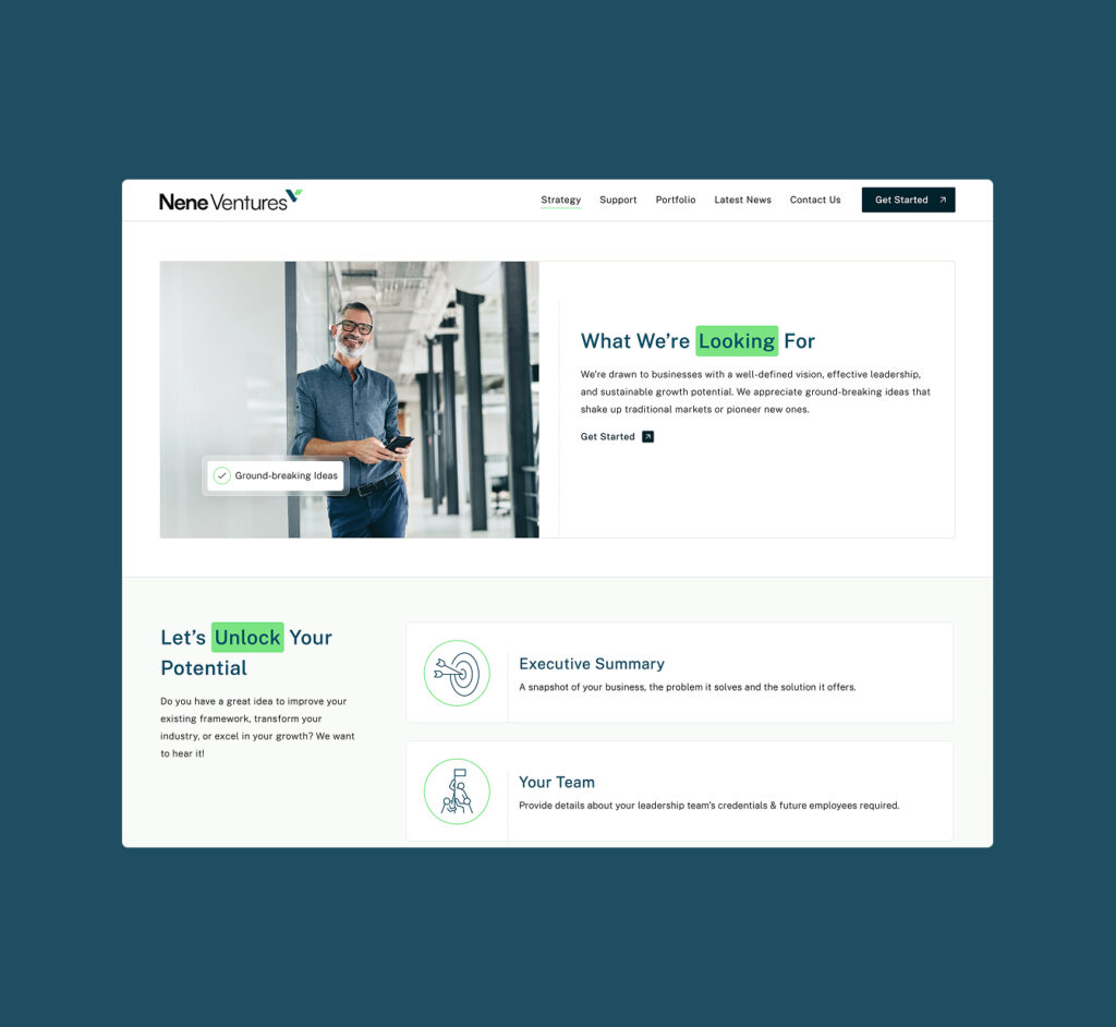 Nene Ventures needed a brand and website that positioned them as a strategic business partner, and not just a source of funding. The new design needed to convey credibility, sophistication, and innovation, while making it easy for entrepreneurs to start their investment journeys.