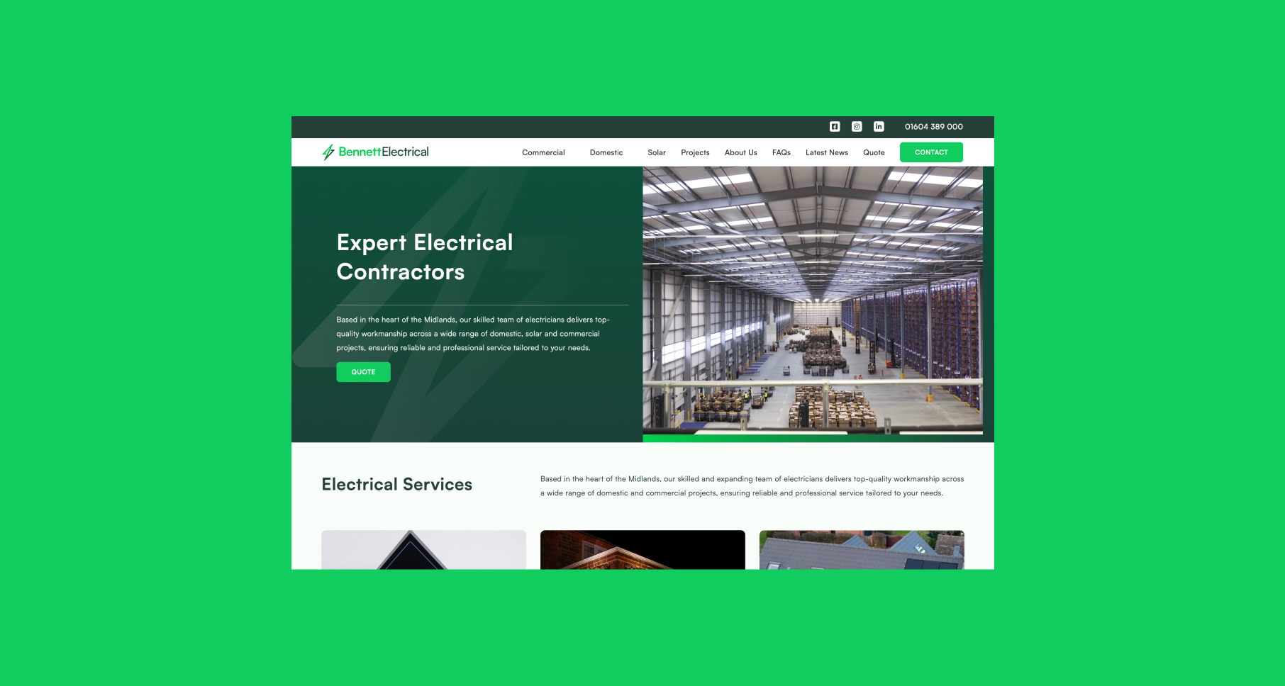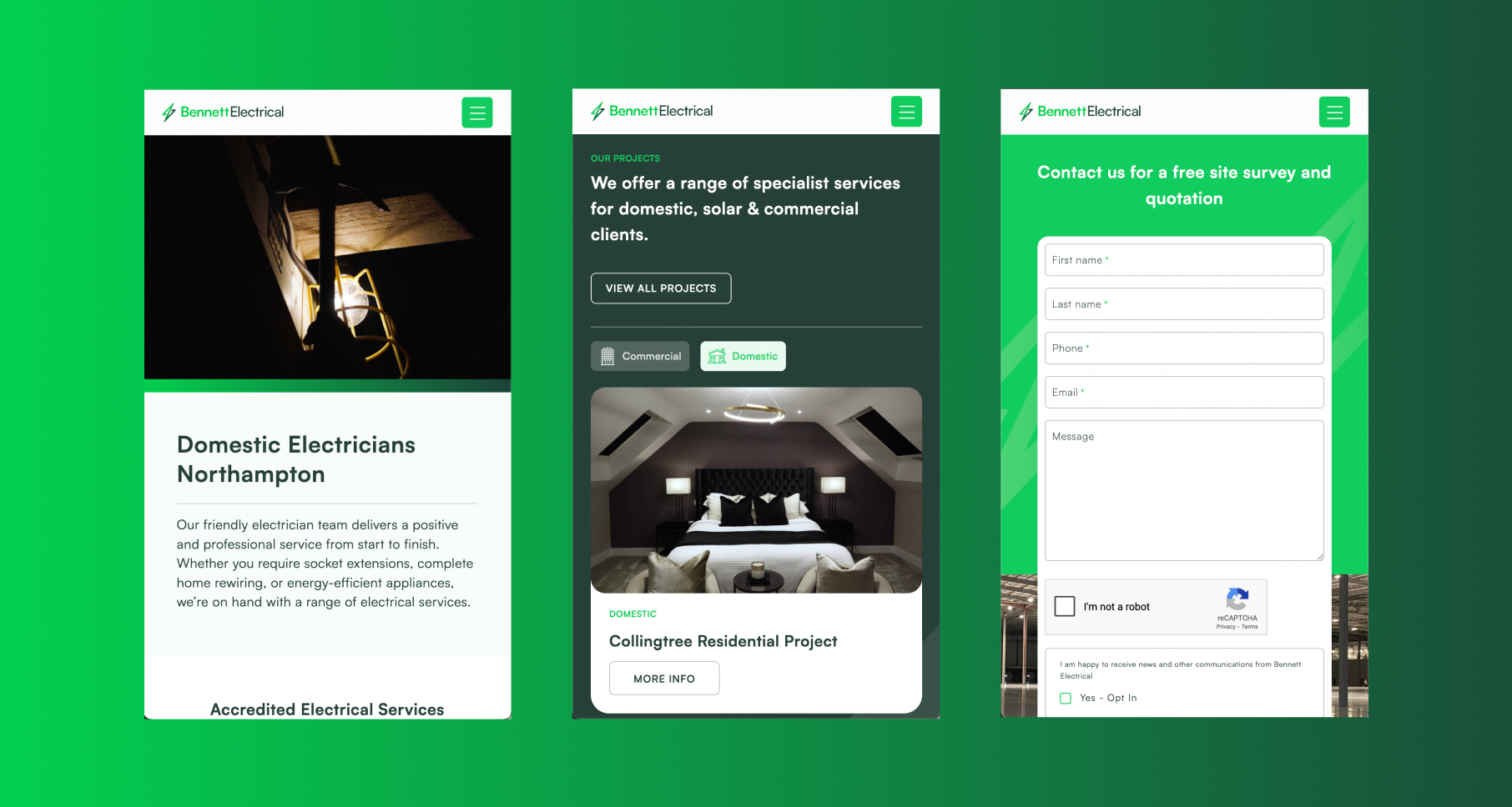 Working with Bennett Electrical enabled us to create not just a website, but a functional and growth‑oriented digital platform tailored to their dual audience: homeowners and businesses. The result is a brand and website that look professional and perform strongly—giving Bennett Electrical the digital foundation to expand their services and reach more clients with confidence.