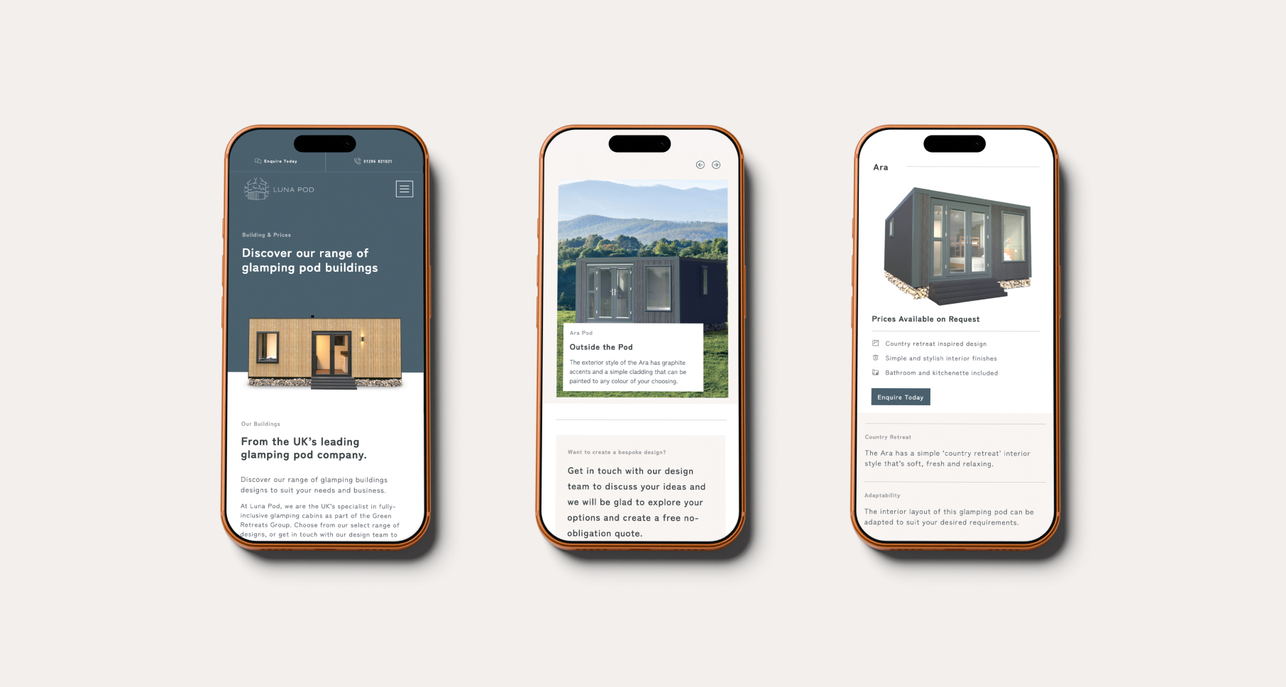 The new Luna Pod website successfully launched a premium digital presence for a brand-new entrant in the UK glamping market. The brand now stands out with a cohesive identity that balances eco-values, luxury, and craftsmanship. Within the first weeks of launch, Luna Pod received increased traffic and quality enquiries, with users praising the site’s clean design and easy navigation. The new brand and website positioned Luna Pod as a credible, high-quality partner for glamping operators and landowners seeking turnkey accommodation solutions.